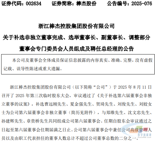 此外,8月11日棒杰股份召开了2025年第三次临时激动大会,补选曹远刚、夏金强、贺琦、刘俊、刘姣为公司第六届董事会非独处董事,与郑维、沈文忠、 孙建辉、章贵桥共同构成公司第六届董事会。